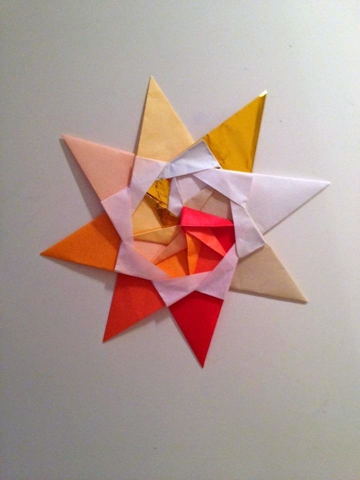 Sadly this idea didn't work. The wonderful paper design I thought to be perfect for this iteration resulted in a second attempt to create this figurine. I was disappointed in myself for not realizing my mistakes sooner. After all, this was the same lesson I had learned from my first iteration. I suppose since I never used such a silky paper like this for origami, I never thought this type of paper would have such a drastic impact on the outcome of this figurine. So, I decided to use another paper design: the polka dots. It still had the color spectrum I wanted except in dotted form. As for the paper itself, the material was your average origami paper. The results? The assemblage step was definitely easier and the paper pieces did held together!